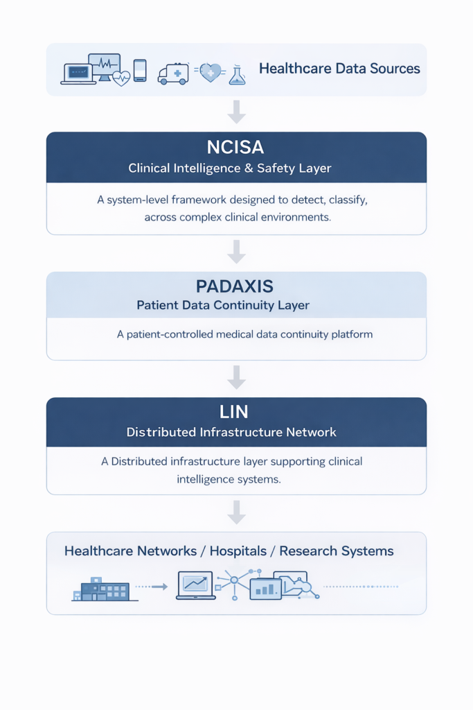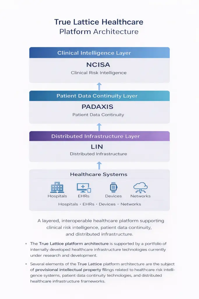 True Lattice Systems is a healthcare technology company developing infrastructure platforms for clinical intelligence, patient data continuity, and interoperable healthcare systems. The company’s core platforms — NCISA, PADAXIS, and the Lattice Intelligence Network (LIN) — are designed to support healthcare safety, patient-controlled data continuity, and distributed clinical intelligence infrastructure.